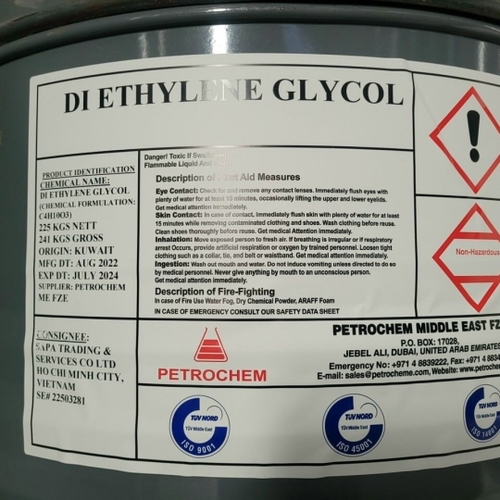 – Ghi nhãn phòng ngừa, “Diethylene Glycol. Chỉ dùng trong công nghiệp. Có hại hoặc gây tử vong nếu nuốt phải”.