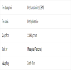 Diethanolamine (DEA) có khả năng hòa tan tốt trong nước và trong một số dung môi hữu cơ thông thường. Dưới đây là một số thông tin về khả năng hòa tan của DEA trong một số dung môi phổ biến: